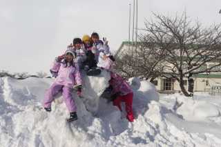 しかし、本日予定していた2年生の後三年スキー場でのスキー教室は、残念ながら中止となってしまいました。どんなにがっかりしているだろうと教室を覗きに行ったところ、さすが前向きな2年生。「来週大台でのスキー教室があるから大丈夫」「今日は外で雪遊びをするんだよ」と嬉しそうに話してくれました。写真は、グラウンドの雪山での雪遊びの様子です。休み時間は雪山に上ることができませんが、授業中に先生と一緒に安全に遊ぶのは大丈夫。時々晴れ間がのぞき、高い雪山からの景色は最高で、おもいきり雪遊びを楽しむことができました。