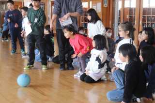 昼休みに運動委員会が企画したボーリング大会が開かれ、たくさんの子どもたちがエントリーをし、技を競いました。ルールは、3人1組で水の入ったペットボトルをボールを転がして倒し、グループで倒した数の合計を競うものでした。